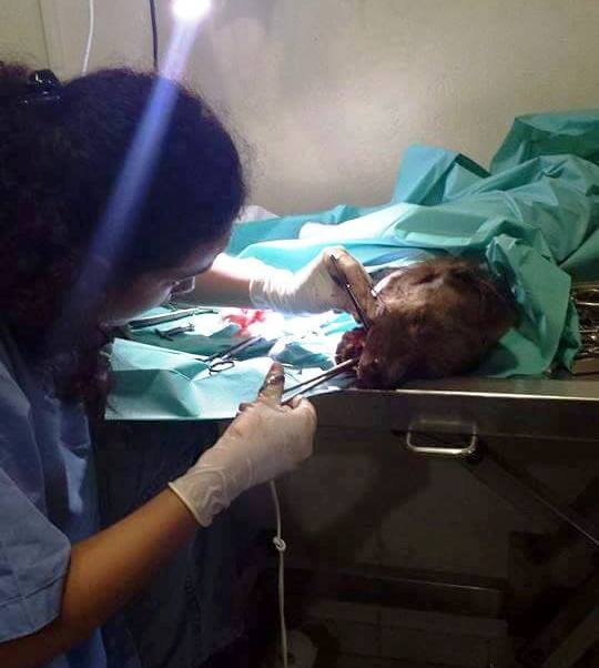 Αρχικά η κτηνίατρος θεώρησε ότι ο μικρούλης ήταν θύμα τροχαίου,μετά τις ακτινογραφίες όμως διαπιστώθηκε ότι το ζώο είχε υποστεί συντριπτικό κάταγμα της άνω γνάθου με επικοινωνία στοματικής και ρινικής κοιλότητας ενώ έλειπαν τα 2/3 της σκληρής υπερώας, όλη η αριστερή άνω γνάθος και η δεξιά άνω γνάθος ήταν σπασμένη σε 3 τμήματα ενώ οι ρινικές κοιλότητες δεν υπήρχαν.Το τραύμα είχε προέλθει από αμβλύ αντικείμενο και καθώς σάπιζε από την μόλυνση και την έλλειψη κτηνιατρικής περίθαλψης,ο μικρός κατάπινε τα κομμάτια.